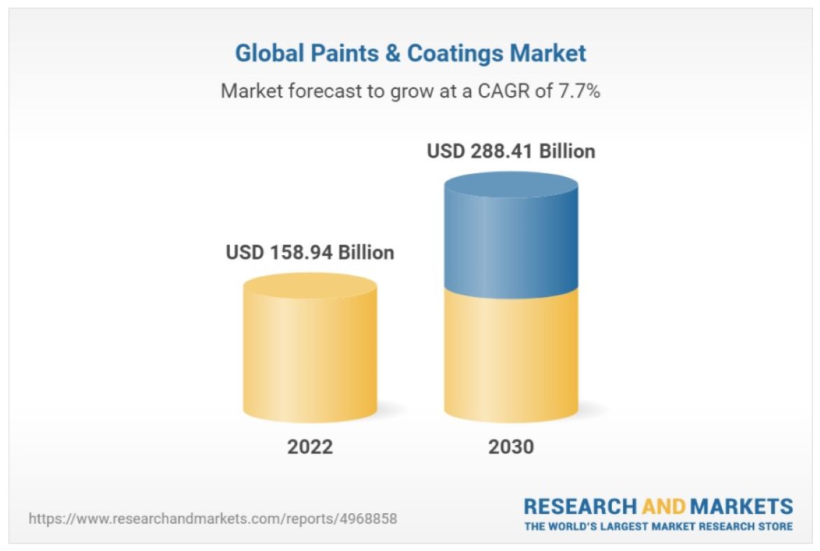 In Research and Markets' recently released report, the global paint and coatings market size was estimated at USD 158.94 billion in 2022, USD 170.73 billion in 2023, and is projected to grow at a CAGR of 7.73% to reach USD 288.41 billion by 2030.