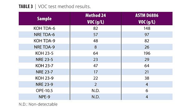 The results of the test methods can be seen in Table 3. Clearly, differences in the measured VOCs are evident. With each product, Method 24 results in lower VOCs compared to those obtained by ASTM D6886. The -latter method appears to pick up on smaller amounts of VOC present. This may be attributed to the greater sensitivity of the GC method as opposed to Method 24’s gravimetric analysis. Despite this, the two methods do demonstrate similar trends between the various ethoxylates. It should be noted that each method was designed for examination of coatings, not to specifically look at individual formulation components.