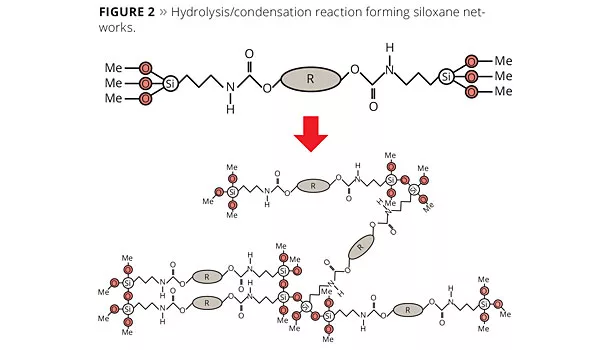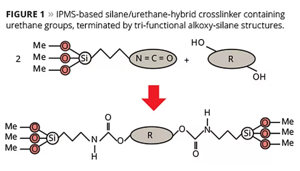 One way to increase clearcoat scratch resistance and satisfy the market needs concerning a further integration of functions is to use silane/urethane-hybrid crosslinkers. As shown in Figure 1, IPMS can be reacted with any kind of (isocyanate) reactive groups (R-group), preferably with hydroxyl groups of diols, polyols or oligomeric diols to build an alkoxy-silane functional urethane-linked non-isocyanate (NISO) crosslinker/binder.