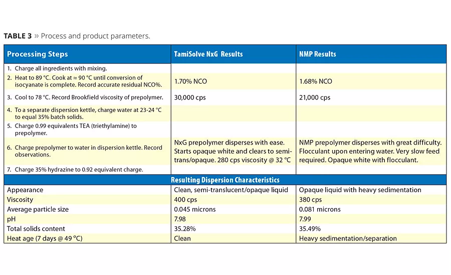 To demonstrate the improved processing afforded by TamiSolve NxG and its ability to reduce the required level of DMPA for acceptable dispersion, two equivalent polyurethane preparations were made. One used TamiSolve NxG as a cosolvent and the second used NMP. A description of these comparative systems and the resulting process and product parameters are shown in Tables 2 and 3.