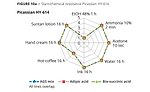 Figures 10a and 10b show radar graphs of the chemical and stain resistance of the final coatings after exposure to typical staining and cleaning media. The legends show the staining agent and exposure times. The numerical rating scale from 1-5 provides a value of worst (1) to best (5) performance of the coating to staining or damage by the reagent.11 As is clearly noted in Figures 10a and 10b, the two replacement formulations based on either biobased SA or petro-based AA are equivalent to the current product and show excellent performance in use. It should be noted that additional additives such as 3% of Stahl’s carbodiimide crosslinker Picassian XL-275 can improve the ethanol resistance to a rating of ≥4. However, the addition of crosslinkers needs additional mixing and is, therefore, less suitable for the DIY markets.