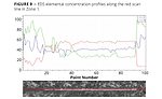 Figure 9 shows the elemental profiles of Zone 1 with the EDS line scanning across the entire scratch. The EDS compositional analysis has verified the morphological interpretations of the SEM image; the coating has indeed delaminated in Zone 2 where element Fe from stainless steel substrate increases, and C and F from the PTFE coating decreases. Zoomed-in SEM images and EDS elemental Hypermaps of Zones 2-4 presented in Figure 10 provide further details of the elemental distributions of the coating and substrate materials along the scratch.