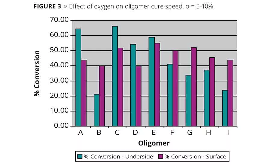 Overall, the percent of acrylate conversion appears linked to molecular mobility before and during cure. Oligomers B, I and J have the highest liquid viscosity but lowest percent conversion due to the decreased mobility at those viscosities. Conversely, the low-viscosity polyester acrylate, A, had one of the highest conversions.