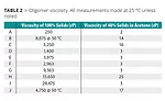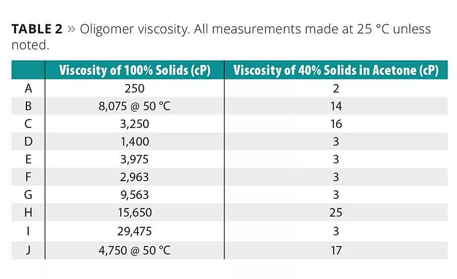 Liquid viscosity is an important property, as it can have a marked impact on formulation possibilities and processing. The viscosity data for each oligomer is shown in Table 2.