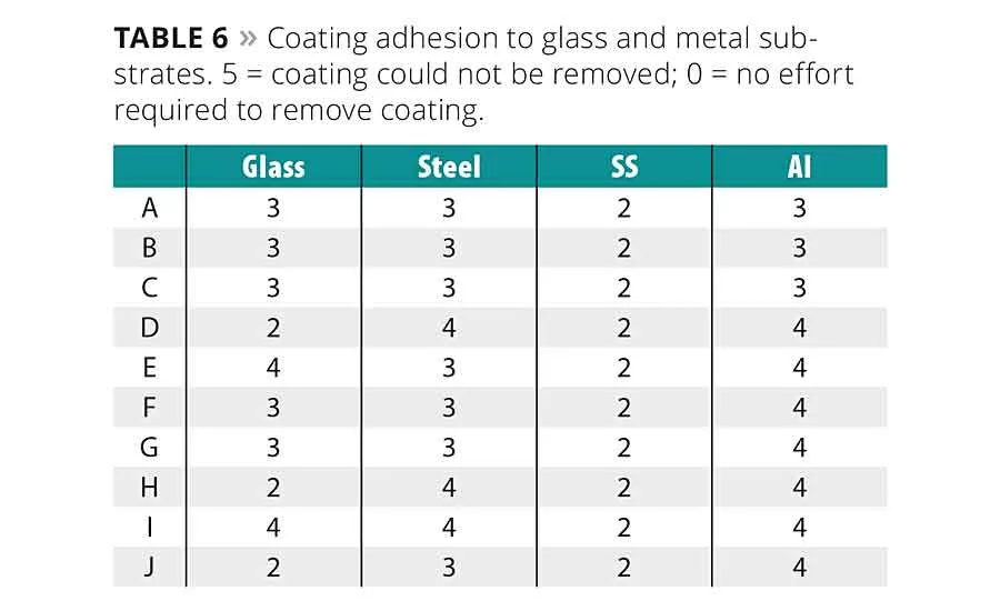 The surface tension of the oligomer coatings is given in Table 5. Surface tension can play a role in a coating’s wetting properties, as well as ultimate adhesion to a substrate. Adhesion data for the coatings to glass, metals and plastics are shown in Tables 6 and 7.