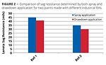 The Leneta anti-sag-resistance test uses a notched drawdown bar in a low-shear method to apply the coating material. Typically, a painter in the field spray-applies an industrial paint on a vertical surface, such as the exterior of a bridge or the interior of a storage tank. Spray application is a high-shear operation that could potentially impact the rheological recovery of the paint and lead to different results. However, for work in a laboratory setting, the Leneta anti-sag test that is done by performing a drawdown on a test chart is a quicker and more convenient way to evaluate the sag resistance of a prepared paint than spray application. Figure 2 shows the sag results of two paints each made with a different industrial RA. Both paints had their sag resistance determined by spray application and also by drawdown application. The results of this comparison are shown in Figure 2. These show that the sag resistance results from the drawdown method used in this study are similar and do correlate reasonably well with a typical airless spray application. This gives more confidence that the lab-produced sag resistance performance data of the RAs discussed in this article has practical meaning in real-world application processes.