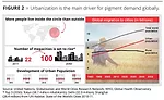 From 1970-2000, the global iron oxide pigment market saw growth of approximately 3.5% per year. In the 1990s, many Chinese producers entered the market, providing low-quality but inexpensive iron oxide pigments. This resulted in higher demand for these pigments, and an annual growth rate of 5.5% from 2000-2006. In 2006-2007, demand for iron oxide pigments reached a peak, at almost 1.1 million tons. Since then, demand has gone down, due to the financial crisis in 2009, as well as technological changes on the customer side designed to save costs. While the iron oxide market bottomed out in 2013, demand started to recover in 2014. LANXESS forecasts that demand will grow at 3% per year in the next five to 10 years, driven mainly by the urbanization megatrend. Suchan stated that as more people move from rural areas into cities, the number of megacities will increase from 22 to 100 between 2011 and 2050 (Figure 2). The growth of urban cities fuels the construction industry, thus increasing demand for iron oxide pigments, which are used in both construction products and coatings.