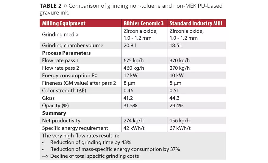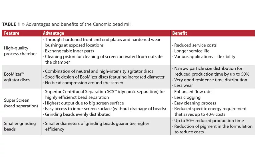 A case study in an industrial environment confirms the importance and benefits of choosing the most suitable milling equipment and grinding media size for a specific grinding task. Bühler’s Cenomic™ full-volume bead mill incorporates patented solutions that allow higher flow capability without compression of grinding beads in the front section of the chamber. The Cenomic bead mill allows for a reduction of the specific energy requirement, a narrow particle size distribution and a higher product quality with lower grinding costs. It is highly recommended for processing high-quality products like protective coatings, paints and gravure inks. Table 1 illustrates the technical solutions the mill offers.