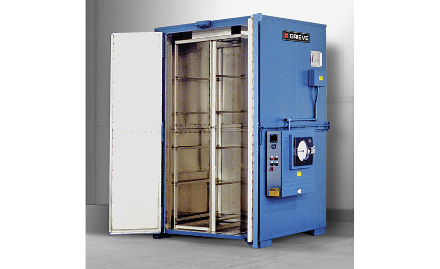 No. 899 is a 500 °F, high-temperature truck oven used for curing a coating on parts hanging from rods. Workspace dimensions measure 48” W x 36” D x 96” H. It has 24 kW installed in Nichrome wire heating elements, while a 1000 CFM, 1-HP recirculating blower provides vertical upward airflow to the workload. E-mail sales@grievecorp.com.