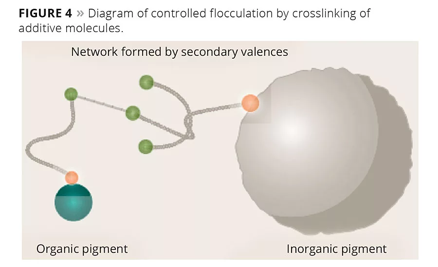 Electrosteric additives prevent pigment particles from approaching each other by “controlled flocculation” (Figure 4). The molecules of the additive interact with each other and the pigment surface, forming a three-dimensional network.1 Floating of pigments is a result of different pigment mobility. With electrosteric stabilization, pigments bind to flocculates of the same color and prevent floating in the dispersion.