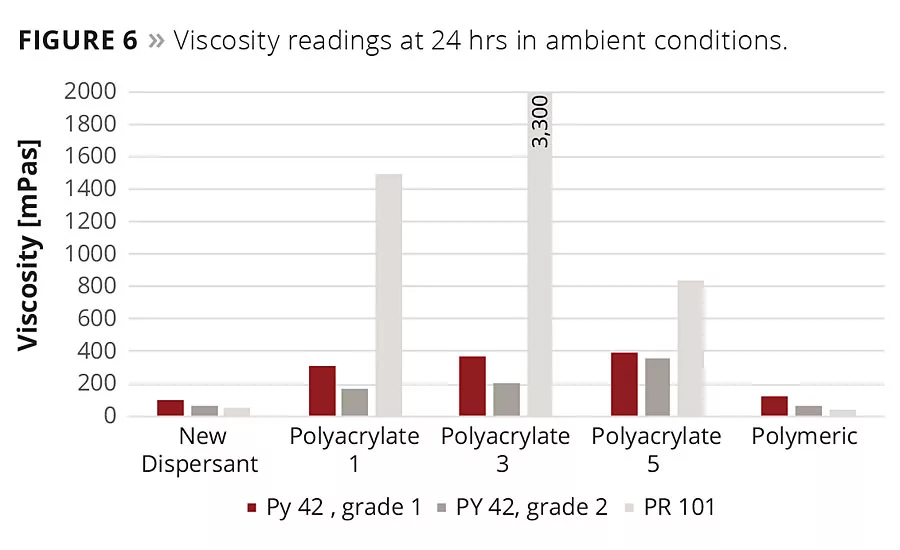 The polyacrylate additives exhibited useful results with yellow iron oxide in the beginning. The polymeric additive and the new additive displayed a very strong viscosity reduction with the yellow oxide. More diverse results were found for the red iron oxide. Only one of the polyacrylate additives could achieve a processable viscosity. The polymeric and new additive achieved a much lower viscosity.