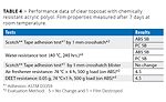 When formulated in 2K topcoats, the high-solid, chemically resistant acrylic polyol provides exceptional chemical resistance, especially to air fresheners, DEET and sunscreen, as well as adhesion to unprimed ABS, PC and PC/ABS. This chemically resistant acrylic polyol also has a middle solid content of 55% weight and a solid hydroxyl value (OHV) of 66 (Table 3).