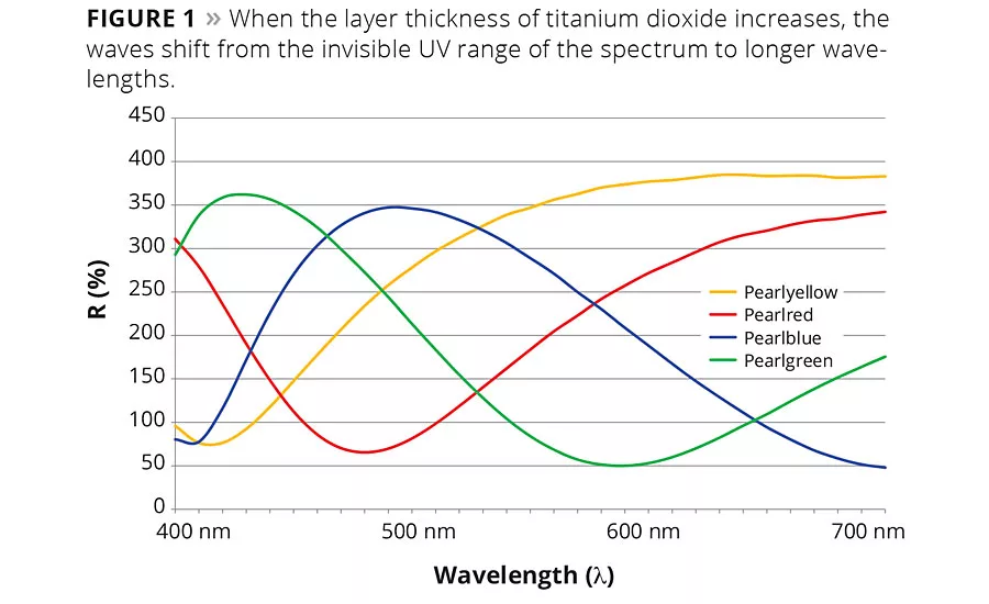 Pigments manufactured with wet chemistry generally have a carrier platelet of natural mica, silicon dioxide or aluminum oxide. High refractive metal oxides such as titanium dioxide or iron oxide are applied to this carrier platelet. Due to different layer thicknesses of titanium dioxide, these pigments change their color from white, yellow, red or blue to green. This unusual color shift results from the fact that the maximums - and also the minimums - move to longer wavelengths. For yellow, the minimum shifts from the UV range into the visible region, whereby white turns into a yellow. This minimum shifts further into the longer wavelengths with increasing layer thickness of the titanium dioxide, which results in a red. The maxima following the minimum in the UV range migrates into the visible range, while the maximum in the long wavelength range travels into the invisible infrared range. With higher layer thickness the blue maximum shifts into the green range. Such pigment group color sequences are thus chemically identical, differing only in the layer thickness (Figure 1).