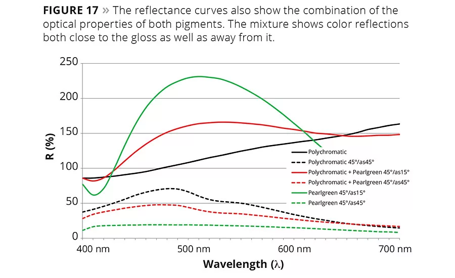 - Admixtures of color pigments influence the color impression over the entire illumination and observation range. Depending on the color of the color pigment, the rainbow is affected and is no longer recognizable in its entirety. Like colors of the interference pigments, the rainbow appears intense only in a narrow angular range. Despite their comparable lower intensity close to the gloss, color pigments produce a stronger overall color impression. As such, they often have a strong influence on the rainbow, which can only demonstrate a strong presence in combination with dark color pigments (Figures 18-19).