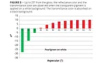 But measurements at a constant illumination angle and varied angular differences to each gloss angle are not limited to an illumination angle of 45°. In principle, the 45° illumination has emerged as the most suitable for characterization. The combination of these measurements results in the so-called “aspecular line,” and the combination of the measured values at a constant differential angle is referred to as the “interference line.” Again, the indication of the aspecular angle is necessary because there may be multiple connection lines. At an aspecular angle equal to or greater than 30°, the transmission colors are measured with transparent interference pigments on a white background.