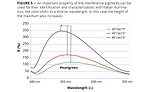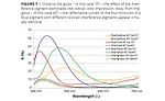 The interference laws - the shift of the reflections to shorter wavelengths with flatter illumination - also apply to these pigments. Presuming aspecular geometry - for example, 55° - and if the reflections of different illumination angles have this constant differential angle, the shift of the maxima to shorter wavelengths with flatter angles of illumination can be clearly seen. Thus, in these pigments, the optical reflection laws apply on the grid and the interference (Figure 12).
