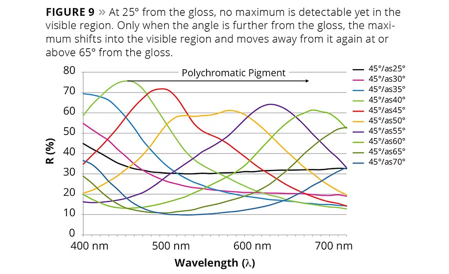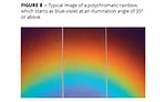 In addition to the known interference pigments, which are prepared by wet chemistry or in a high vacuum, there are special types of interference pigments. Their optical response corresponds to reflections on the grid. The incident light is known to be spectrally fragmented, from blue-violet over blue, green, yellow to red. Unlike “normal” interference pigments, which show a color gradient depending on the angle of illumination, a complete rainbow is always evident in the polychromatic pigments (Figure 8). Its colors can be measured individually -the eye has a greater observation and detection range than a measuring instrument and sees a complete rainbow. The range of the rainbow lies in an angular range of 20 to 30 degrees depending on the angle of illumination: with flat 65° illumination the rainbow starts at about 45° and extends to about 75° from the gloss angle. With steeper illumination at 45°, the range shifts from 35° to 65°. These are the limits for the colors of the 1st order. The colors of the 2nd order follow in this range; are measurable, but barely visible.