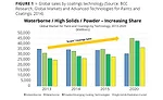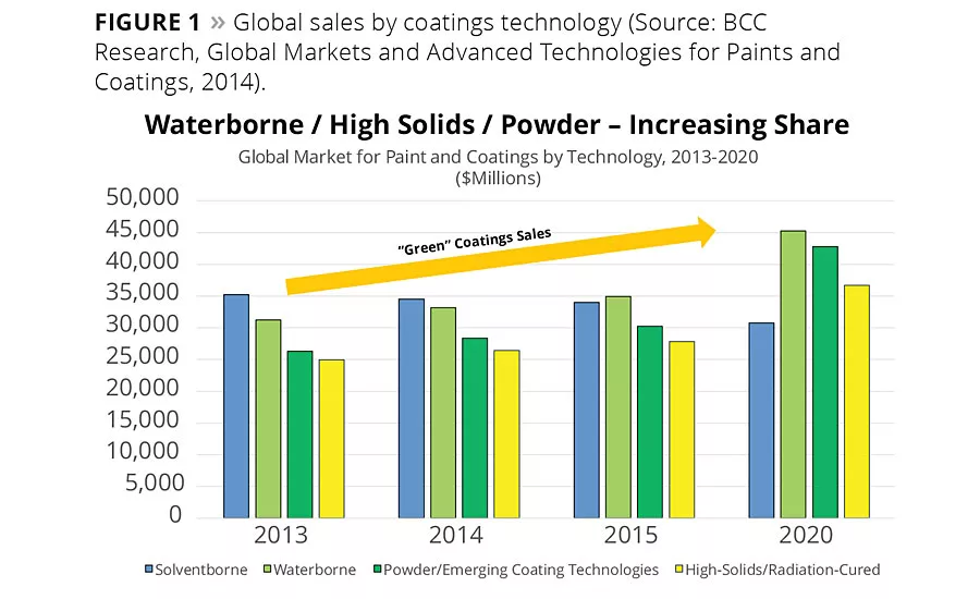 The growth of environmentally friendly coatings technologies such as waterborne, powder and high solids has progressed steadily to the point where nearly 75% of global coatings sales are derived from these technologies. This trend is projected to continue into the future (Figure 1).4