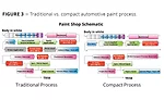 Another important aspect of total cost is the cost of the coating process. “Compact process” automotive painting is now spreading through the industry because of energy savings resulting from the elimination of one of three main curing ovens in a typical automotive paint line, along with some of the associated sanding operations. This has been done without sacrificing coating durability or physical properties. Up to 30% energy savings (relative to the traditional process) has been realized with this new process. Additionally, improvements in plant productivity, greenhouse gas emissions and VOC emissions have been realized (Figure 3).21