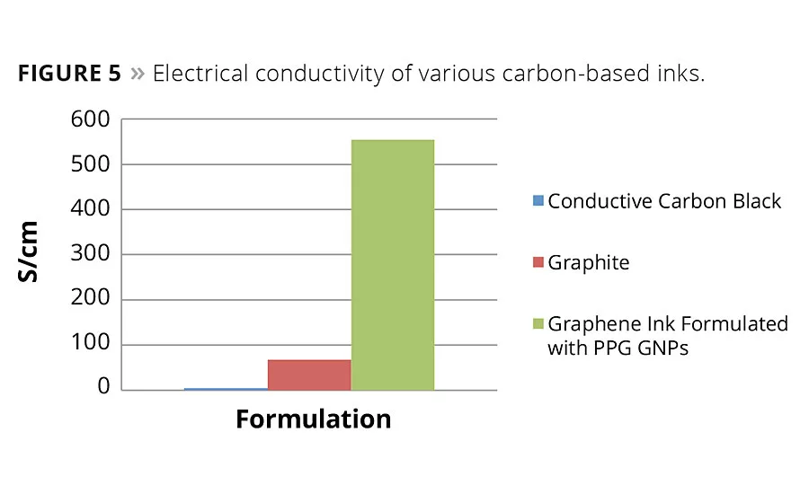 If we look to the future, there are several trends that could be addressed by the coatings industry in markets that most would consider nontraditional. Waste reduction and cost are driving many manufacturers to consider additive manufacturing methods. Because of this, printable electrically conductive inks that are used in an “additive” manner as opposed to subtractive etching techniques are being used in RFID tags, mobile device antennas, flexible heating devices and many other everyday items. Future use in photovoltaic and OLED devices is predicted.26 We have developed carbon-based inks with good conductivity (Figure 5). Graphene nanoplatelets (GNPs) have proven useful in this application. Scalability and cost will determine the viability of this approach.