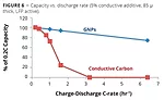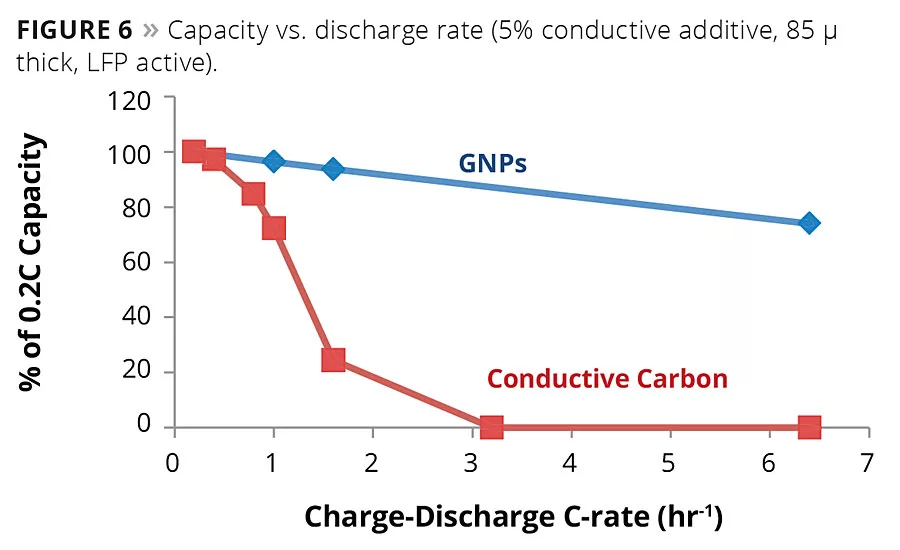 Batteries are composed mainly of coated metal. Battery actives are typically metal oxides. The coatings industry is experienced in the dispersion of metal oxides. We know how to control defects and improve adhesion to metal surfaces. These competencies will impact the issues that battery manufacturers face today. One example of an issue that the battery industry faces is the possible need to eliminate NMP from battery-active coatings for regulatory and cost reasons. There is also industry interest in waterborne coatings for batteries. The coatings industry has experience with such matters. The use of graphene in battery coatings may also be beneficial. As seen in Figure 6, GNP-based battery cathodes can be formulated with better capacity retention relative to those made of conventional carbon.