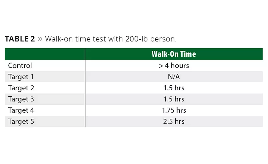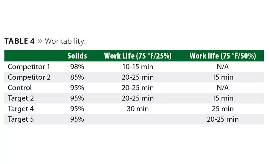 When testing for workability (Table 4), we noted that the system containing higher concentrations of Polyaspartic 3, such as in the Target 5 formulation, offers better workability or work life. This is due to the extremely low initial viscosity of the Polyaspartic 3 resin as supplied. Polyaspartic 3’s initial viscosity is 100 cPs as compared to other polyaspartic resins >1000 cPs. This lower viscosity allows for better reflow properties of the system while still having a rapid cure time. We also noted that higher concentrations of Polyaspatic 1 yielded poor workability due to the rapid reaction rate. The formulations can achieve similar work times to commercially available systems at higher solids.