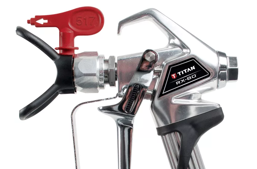 The RX-80 airless spray gun is a professional airless spray gun rated for 3,600 PSI, providing paint contractors with more durability and performance. For improved ergonomics and handling, the RX-80 features Titan’s exclusive Comfort Grip™. It has a new and improved swivel, two- and four-finger triggers, and a lighter trigger pull. With better optimized fluid passage, the RX-80 provides paint contractors with improved performance and longer gun life. For easier cleaning, the wrench is built into the trigger guard. The RX-80 has an updated, rugged design and replaces the Titan LX-80 and G-10XL spray guns.