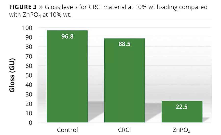 The gloss of the coatings for the CRCI material was measured and compared against the coating without the CRCI as well as a coating containing the traditional inhibitor for steel, zinc phosphate (ZnPO4). The difference between the two materials and the minimal impact of the CRCI material in the coating is apparent on visual inspection. Gloss measurements of the coats were performed, with the results shown in Figure 3. The control coating and the CRCI-containing coating are very similar. They are within the margin of error of the measurements across the film. The ZnPO4 coating has a significantly low gloss value and could be classed as a matte finish. While the materials are capable of being used as a corrosion-control agent in a primer (substituting for ZnPO4), the advantage of the matrix-controlled release material is the potential for incorporation into a direct-to-metal (DTM) topcoat. This would add corrosion inhibition functionality to the topcoat. It would potentially reduce the need for two coats in a system by removing the primer and maintaining the gloss.