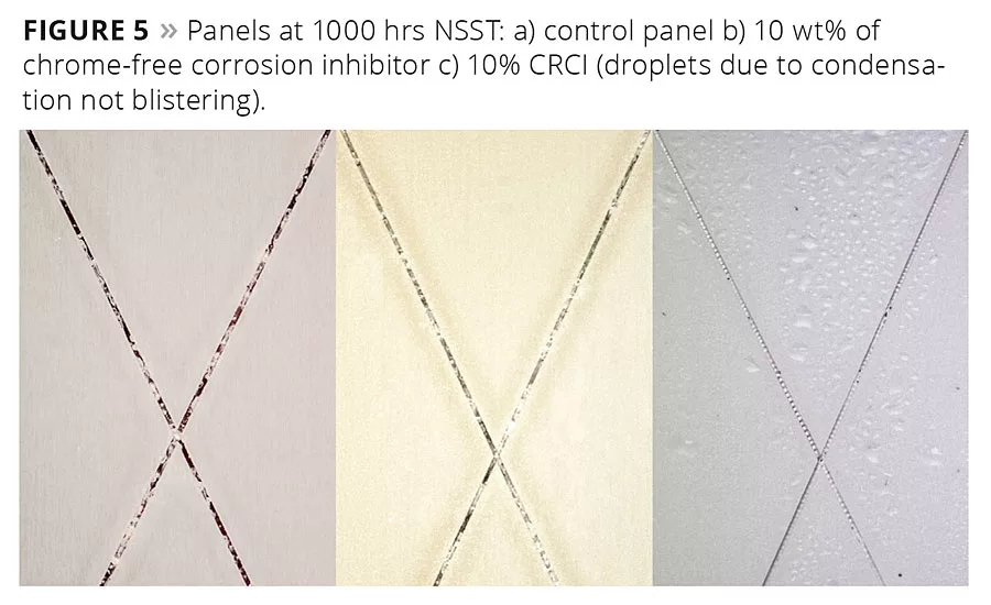 The CRCI materials were tested against a nonchromate inhibitor in the NSST. The active in the matrix is released into the scribe during testing by diffusion from the matrix and it preserves the shininess of the scribe as is seen with traditional chromate inhibitors. This shininess was preserved for just under 1000 hrs in NSST. The coatings themselves demonstrated similar performance to other nonchromate inhibitors shown to have an inhibitory effect on corrosion out to 4000 hrs. No blisters or corrosion products are seen in the scribe. The shiny scribe can be seen in comparison with the controls in Figure 5.