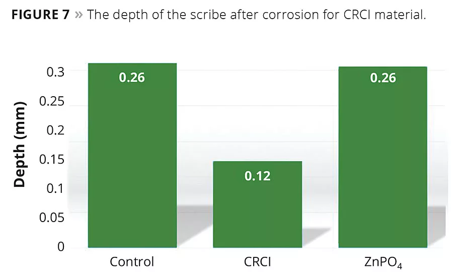 Using a profilometer the depth of the scribe for the steel plates was measured after scrapping, once 1000 hrs in NSST was completed. The scribe depth measurement was used as a method of comparison between the traditional corrosion inhibitor (ZnPO4) and the CRCI material. The results can be seen in Figure 7 and it is obvious the CRCI material has significantly slowed or stopped the corrosion process in the scribe while both the control and the ZnPO4 sample have undergone significant corrosion in the scribe, as seen with an overall increase in scribe depth when compared to the CRCI sample.