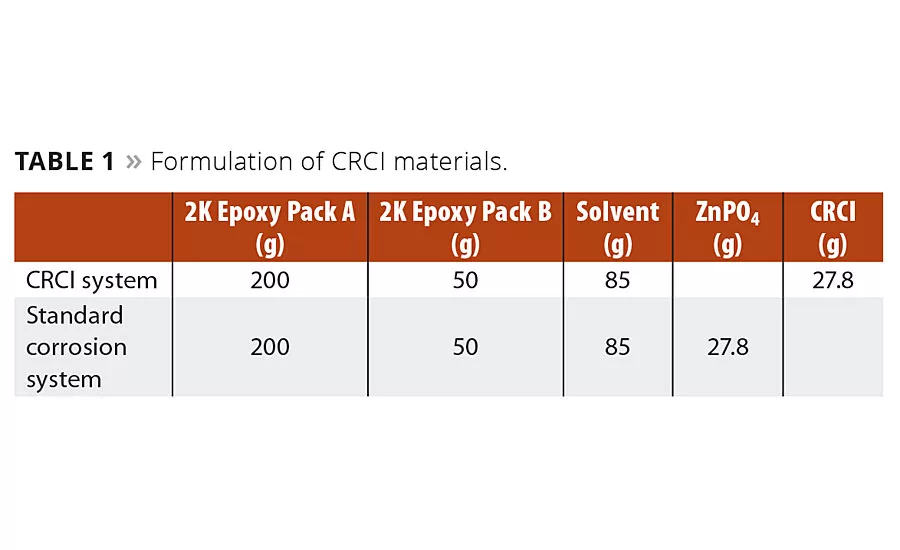 The CRCI particles are easily incorporated into coatings of different chemistries (epoxies, alkyds, urethanes, powder coatings), including solventborne, waterborne and high solids. A typical application is a 2K epoxy coating. The CRCI particles are homogenously dispersed into the coating resin. There is no significant impact on mixing or viscosity of the mixture due to the addition of the CRCI smart pigments. The material acts as a normal pigment in its addition due to being silica based. A typical formulation is shown in Table 1. As the materials are a matrix, they can withstand a milling (or extrusion) step without premature release of the active; this is in contrast to traditional encapsulated technology (i.e. capsules), which will break open and prematurely release their payload under such conditions and as such must be formulated post processing in an extra step. The CRCI particles also allow for the formulation of corrosion-inhibiting actives that cannot normally be used in paint formulations because of their destabilization effect on the paint (e.g. hydrophobes in water-based paints) or by catalyzing the resin polymerization.