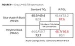 This difference in scattering areas can be seen when looking at the visual and TSR opacities at different P:B ratios. The standard TiO2 has higher visual opacity for any level of pigment loading. Considering that the TSR opacity looks at the complete spectrum, including visual opacity, the IR-optimized white has a higher TSR opacity at any pigment loading. The IR-optimized version is also gaining TSR opacity faster than the standard TiO2 (Table 8).