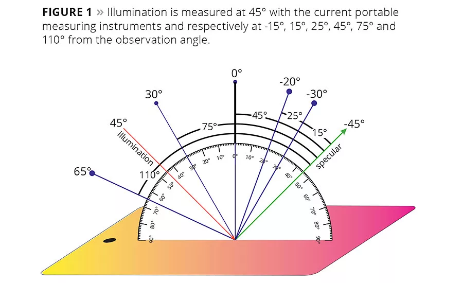 The specular angle corresponds to illumination angle; for practical reasons, the angle is preceded by a minus sign, which is physically incorrect. If one were to observe the gloss of the vehicle, the aspecular angle between gloss and observation would be 0°. When moving away from the gloss, the aspecular angle becomes greater. Instrument manufacturers refer to this aspecular angle, which usually is 15°, 25°, 45°, 75° and 110°. Accordingly, the corresponding and absolute observation angles are -30°, -20°, 0°, 30° and 65°.