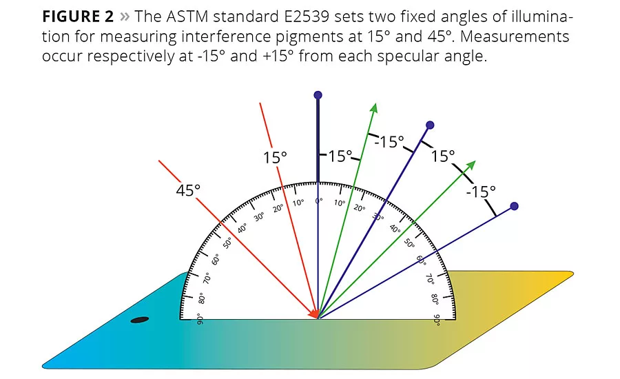 Colored interference pigments (see next rule) are characterized by a shift in color when the angle of illumination is changed (Figure 3). Ideally, it is measured with a steep, classic and flat illumination at 15°, 45° and 65° from the normal, respectively at 15° from the specular angle.