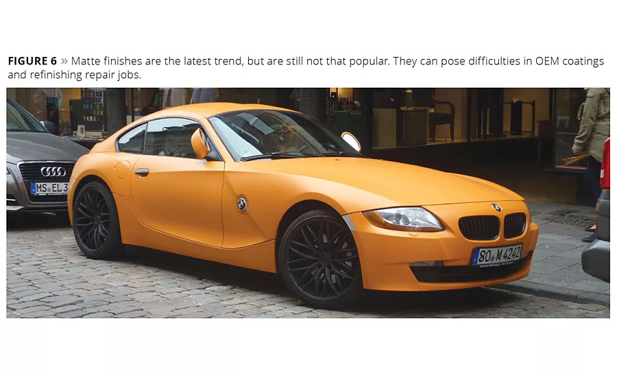 Most standard colors like white, black and silver are normal color creations without much zest. Such colors help to attract a large number of car buyers while generally avoiding a discussion about tastes in color. Nevertheless, there are always requests for a special type of finish and color. For example, car manufacturers offer finishes with colored or matte clearcoats for which the reproducibility cannot necessarily be guaranteed (Figure 6).