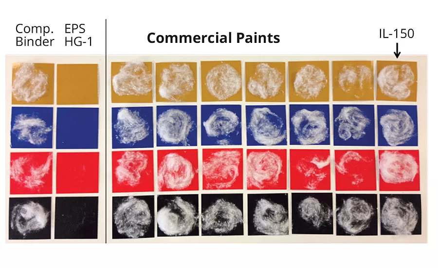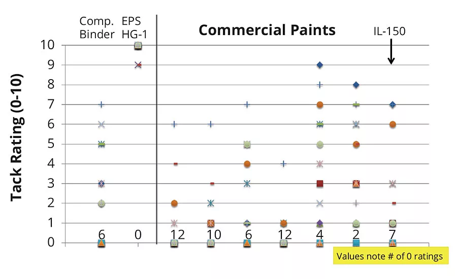 The HT cotton ball tack data for the paints tested in the colorant benchmark study is shown in Figure 9. The HT cotton ball tack values are rated from 0-10, with 10 representing 0% cotton stuck to the exposed paint sample, and a rating of 0 representing 100% cotton stuck. Each of the 16 paints for each base was ranked and the values are represented vertically in Figure 9. The EPS HG-1 paint base was rated 10 (0% cotton remained) for 14 out of the total 16 paints tested, and the other two paints were rated with a value of 9 (10% cotton remained). The IL-150 commercial paint was rated in the HT cotton ball tack test with seven rankings of 0 (100% cotton stuck), and 14 of the 16 paints tested being rated 3 or less (70% or more cotton stuck). A picture of the HT cotton ball tack test results for the colorant B system is shown in Figure 10. Visual assessment of the cotton ball tack test results shows the EPS HG-1 maintained low-tack performance at elevated temperatures. The competitive polymer and commercial paint bases shown in the picture had large amounts of cotton stuck and were rated accordingly, shown in Figure 9. The picture shown is only for the colorant B system; however, the other three colorant brands tested had almost identical results to the one shown in Figure 10. The EPS HG-1 polymer technology maintained low-tack performance in both the RT tensile tack test and the HT cotton ball tack test, whereas the IL-150 paint base was rated to have low-tack performance at RT but failed for tack performance at elevated temperatures. From the two tack tests performed, the EPS HG-1 paint base at 17 g/L VOC was concluded to have the best low-tack performance at both RT and HT testing compared to the other paint bases tested.