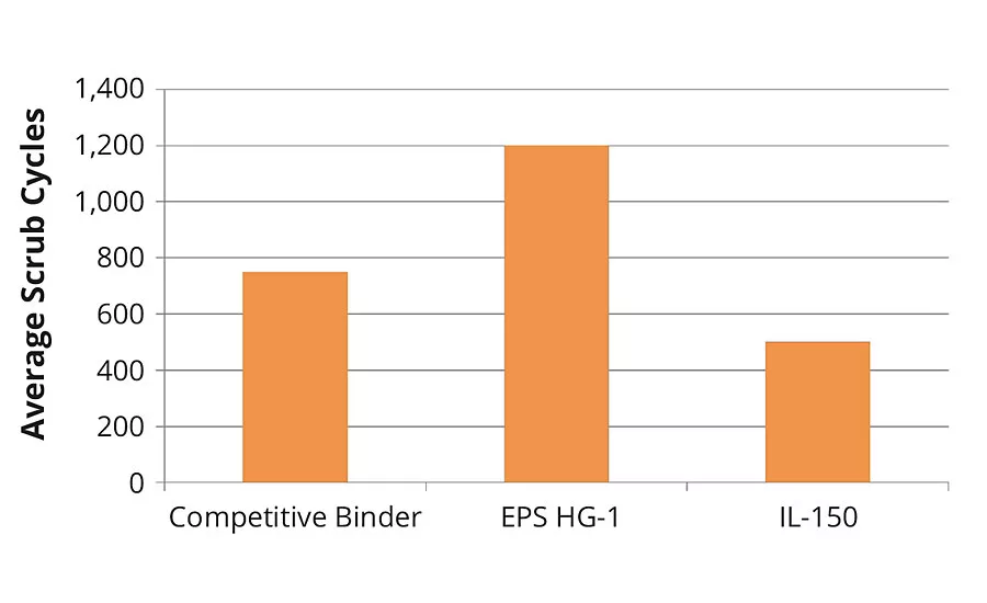The competitive binder paint scrubbed for less than 800 cycles, and the IL-150 paint scrubbed for 500 cycles on average. In comparison, the EPS HG-1 paint scrubbed for 1200 cycles. The conclusion was made that at 17 g/L VOC, the EPS HG-1 had superior scrub performance compared to the 150 g/L VOC industry-leading commercial paint and the 17 g/L VOC competitive polymer paint.