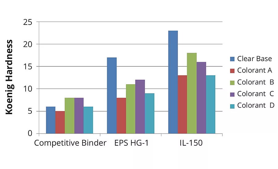 Koenig hardness was run on each clear base (untinted) and the YOX paints for the competitive polymer, EPS HG-1, and the IL-150 for each of the colorant brands from the colorant benchmark study, shown in Figure 13.