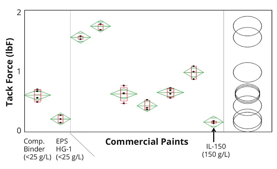 The optimized run parameters were used on a tensile tester at RT to measure the tack of paints for the benchmark colorant study in units of force. As previously stated, the lower the force measured to remove the probe fixture from the paint sample, the better the RT low-tack performance of the paint. The YOX color of each paint base for the colorant brand B was analyzed for tack on the tensile tester at ambient temperatures. Tukey t-test statistical analysis, box plots and mean diamonds for the tack measurements made on the YOX paint samples for the colorant B brand are shown in Figure 6. The Tukey analysis was used to compare the mean tack force of each paint to the other paints in the data set. The results show that the performance of EPS HG-1 paint was not statistically different than the IL-150 paint for tack force measurements at RT. The EPS HG-1 polymer was also statistically lower in tack force than the market-leading competitive polymer and most of the other commercial paints. From this data, the conclusion was made that even at 17 g/L VOC, the EPS HG-1 paint had comparable low-tack performance at ambient conditions to the IL-150 paint, and also had better low-tack performance than the remaining paints in the sample set.