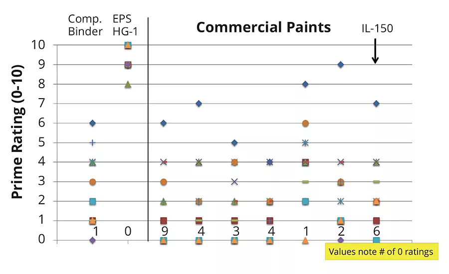 The data for cheesecloth print resistance is shown in Figure 8, and the data for the 16 paints for each paint base is represented vertically. EPS HG-1 was rated between 8 and 10 (10 representing no imprint left on paint) for all the 16 paints in the base tested for print resistance. All the other commercial paints and competitive binder were ranked for print ratings of less than 5 on average. The IL-150 paint base was rated with one ranking of 7, six rankings of 0 and the remaining paints in the base of less than 4. The 17 g/L VOC EPS HG-1 paint base was concluded to have superior print resistance compared to the competitive polymer and all the high-quality commercial paints tested.