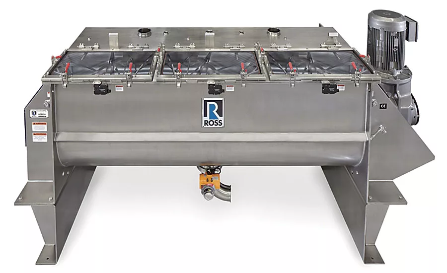 Model 42N-120SS 120-cu.ft. ribbon blender includes a solid agitator shaft with precision-formed ribbons with angled leading edges. Scrapers welded to the spokes and ribbons have a close tolerance (1/8”) to the end walls. Visit www.mixers.com.