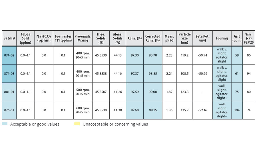 Possible foaming during pre-emulsion mixing of systems with high IDMA content was a concern at higher agitation speeds. However, while we observed slightly more foam immediately after the pre-emulsion mixing stage at higher agitation, the foam quickly collapsed at the end of the three-hour feed, even at 600 rpm.