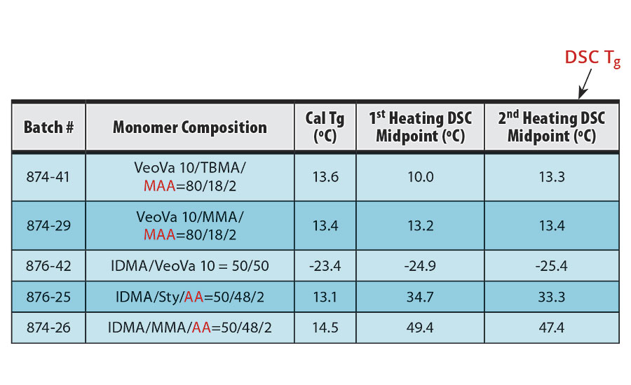While the measured Tg for the copolymers of VeoVa 10 monomer with other monomers including VeoVa 10/IDMA copolymer were consistent with calculated values, Tg for the IDMA copolymers with styrene and MMA shown in Figures 4 and 5 were significantly higher than expected. The incorporation of MAA into the polymer has a greater effect on the transition point than the incorporation of styrene. Molecular weight and other polymer characterizations might be required to better understand the higher transition points of IDMA copolymers.