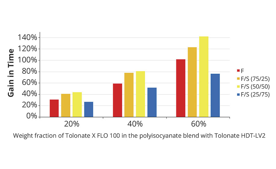 The impact of Tolonate X FLO 100 in these systems on the time needed to double the viscosity or to reach the gel point of these systems clearly indicates its potential to increase the pot life of polyaspartic acid ester-based coating systems.