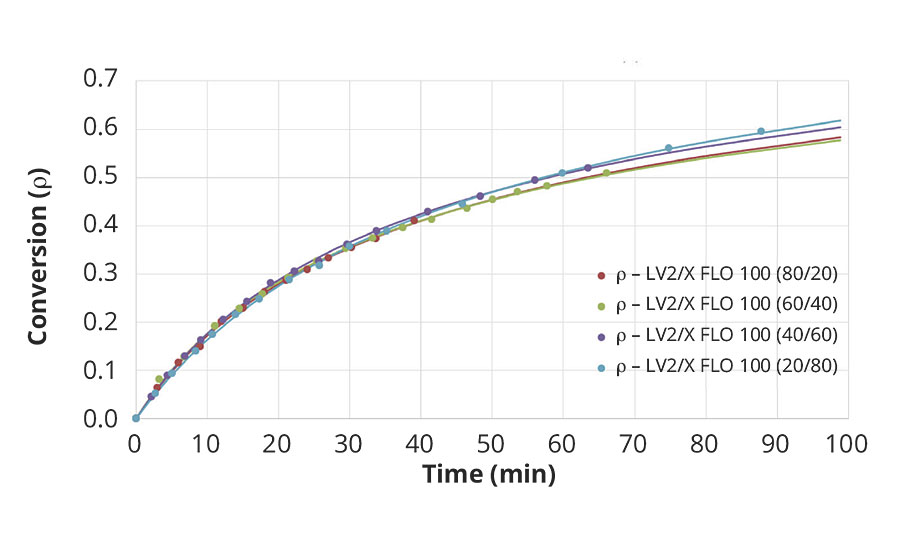 FIGURE 4 » Early viscosity evolution upon crosslinking of a polyaspartic ester resin, Teraspartic 277, with blends of a low-viscous HDI-based polyisocyanate, Tolonate HDT-LV2 and the reactive diluent, Tolonate X FLO 100, at stoichiometry NCO/NH=1. The polyisocyanate blends are indicated with their respective weight ratio between low-viscous HDI-based polyisocyanate and the reactive diluent.