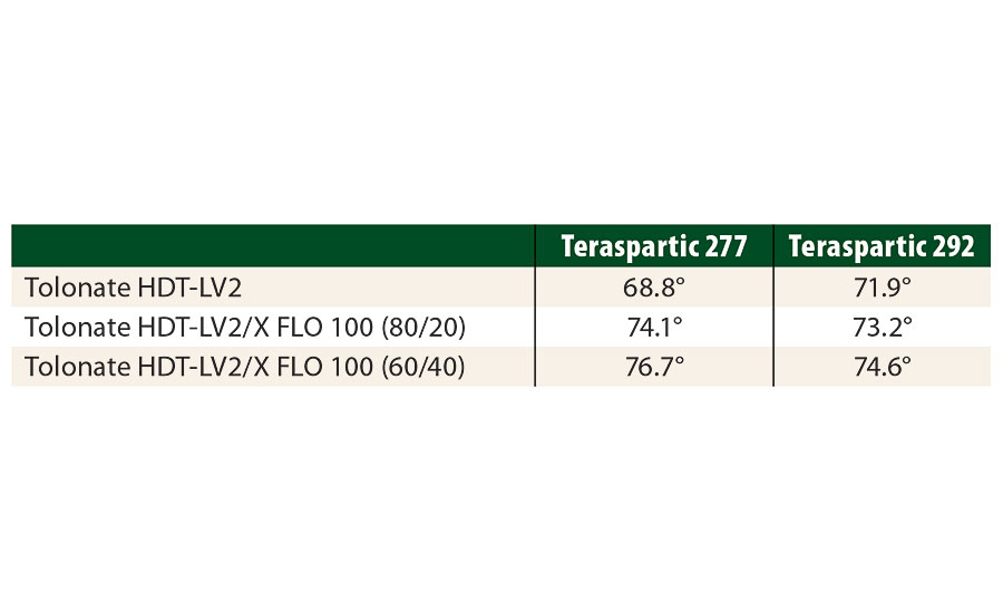 TABLE 8 » Contact angle measurements for films based on polaspartic ester resins crosslinked with HDI-based polyisocyanate blends containing different amounts of the reactive diluent.