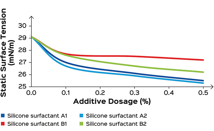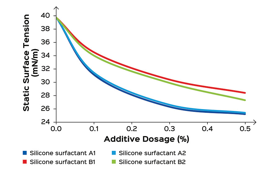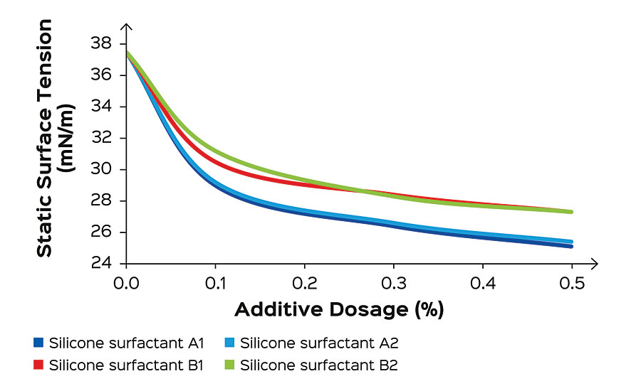 As part of an application technology study, the silicone surfactants A1, A2, B1 and B2 listed in Table 1 were compared with one another. For this purpose, these four surface additives were added to a variety of representative, aqueous wood coating systems in differing dosages, and their influence on the static surface tension, the improvement in leveling of the coating, and the tendency to stabilize foam within the coating application were tested.