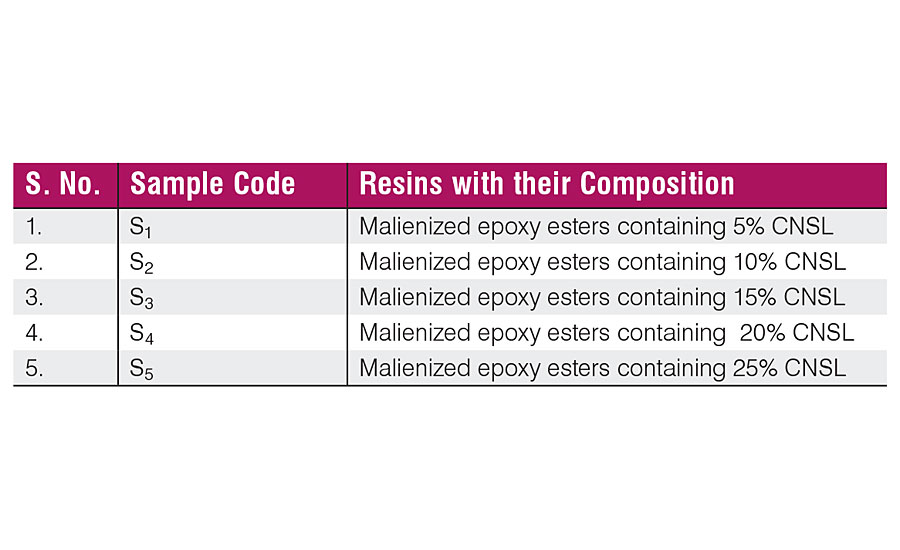 For the synthesis of water-based CNSL-modified resins, a calculated amount of maleinized fatty acid epoxy ester resins was put in a three-necked round bottom flask. To this, 5 to 25% of CNSL was added on the basis of maleinized fatty acids at 110-115 C. The samples were withdrawn from the reaction mixture to check the acid value. The co-solvent ethylene glycol monopropyl ether was added at around 80 C to the final resin.