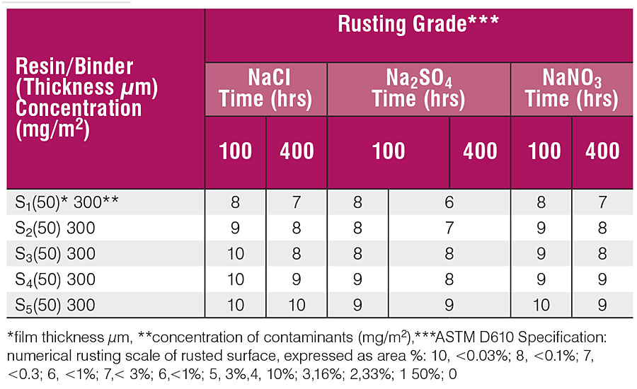 Cold rolled mild steel panels without visible rust were used. One side of the specimen was contaminated using 200 and 700 mg/m 2 of Cl - , SO 4 -2 and NO 3 - . Uncontaminated steel panels were used as controls. Sodium chloride, sodium sulphate and sodium nitrate solutions were prepared by using reagent grades and distilled water. The above prepared coatings were applied, and the coated specimens were left for 1 week in the laboratory at room temperature for complete curing. After, the uncontaminated reverse side of the specimens was protected by a strippable coating. The edges were sealed with wax. The coating was applied at a thickness 50 µm. The exposure times were 100 and 400 hrs.