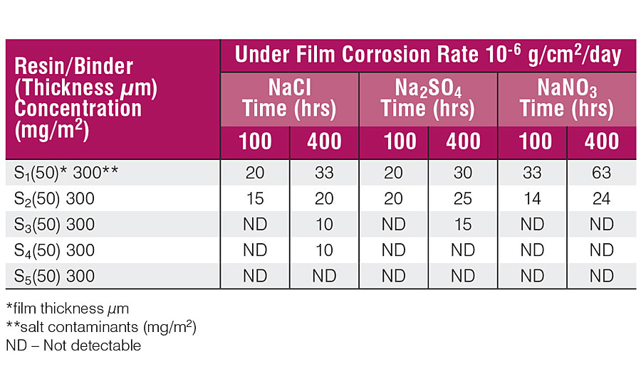 The specimens were carefully observed during the test for rusting and blistering according to ASTM D610 and D714 specifications, respectively. The under-film corrosion rate was determined gravimetrically by weighing the specimens before the application of the contaminants, and after the test and removal of the coating and corrosion products.